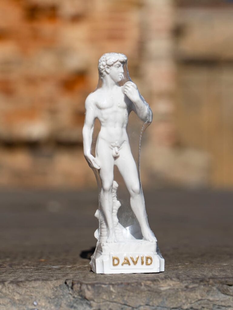 Il cellofan soffocante avvolge una delle innumerevoli mini-copie da bancarella del David. Una pellicola trasparente adagiata tanto perfettamente sulle forme dell’oggetto da potervi immaginare una colata di liquido vischioso che, in pochi secondi, impedisce il movimento e il respiro.