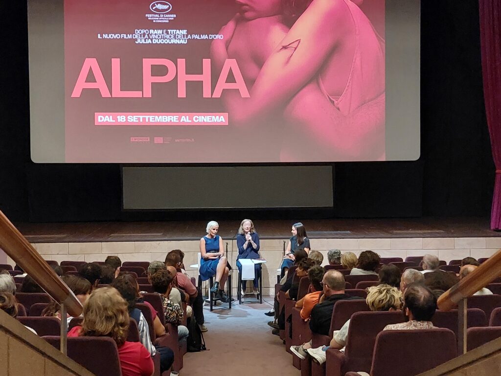 Ducournau costruisce un impianto filmico potente, forse discontinuo ma che lascia il segno. La regista, classe 1983, ha ricordato (in un affidabile italiano) che Alpha è il suo film “più personale e profondo” e che “non è una commedia ma nemmeno un Titane 2”