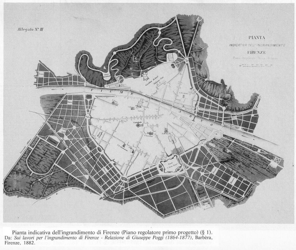 Fu l’architetto Giuseppe Poggi a essere incaricato di redigere un piano di ammodernamento capace di adattare Firenze al nuovo ruolo politico-amministrativo. Il cosiddetto “Piano Poggi” rappresentò uno dei più ambiziosi interventi urbanistici dell’Italia ottocentesca: l’abbattimento delle mura medievali, la creazione dei Viali di Circonvallazione, il ridisegno dell’area di San Frediano e dell’Oltrarno, la nascita di nuovi quartieri residenziali e borghesi come il quartiere della Mattonaia.