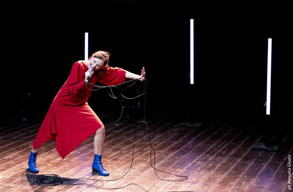In scena ci sono io, cinque barre led che si illuminano drammaturgicamente, quindi a seconda di quello che sto raccontando, un microfono e il filo del microfono molto, molto, molto lungo. Il microfono è per me una maschera che racconta e vende la parte migliore di noi, dell’altro e della relazione, a noi, all’altro e per difendere la parola insieme. Le maschere però possono scivolare per sbaglio, sfuggire per disattenzione o addirittura cadere per scelta, anche perché dopo un po’ pesano, prima di tutto su chi le indossa. E può succedere di restare nudi, a voce libera, lì dove non si voleva o poteva vedere, dove non si sapeva, dove forse si intuiva, dove si ha che fare con la parte più oscura. Lì dove si è da soli. E proprio quello di cui si aveva così terrore diventa una realtà. Il filo del microfono è per me un elemento di grande imprevedibilità: ci gioco, ma mi ci incastro anche. È per me una metafora della dipendenza, di queste relazioni di co-dipendenza e il fatto che il pubblico veda il “pericolo” prima di me, mi piace: non è in fondo così in queste dinamiche? Sono gli altri a vedere che c’è qualcosa che non va, prima di noi che fatichiamo così tanto ad ammetterlo, in primis con noi stessi. Nel periodo di scrittura ho letto molto Annie Ernaux e mi torna spesso in mente questa sua frase tratta da “Memoria di ragazza”: “tra le mie carte ho ritrovato questo appunto, una sorta di dichiarazioni d’intenti: esplorare il baratro tra la sconcertante realtà di ciò che accade nel momento in cui accade e la strana irrealtà che, anni dopo, ammanta ciò che è accaduto”. La trovo molto significativa, anche per questo lavoro.
